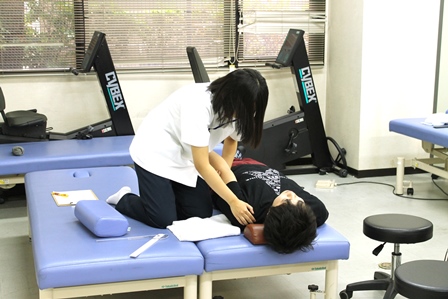 患者役の学生(クラスメイトや理学療法学科の4年生)や卒業生に対して、15分程度で検査を行い、それを教員がチェック項目に従って評価を行い、フィードバックを行います。
