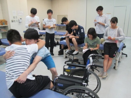 これは、少し応用編ですが車いすからベッドへの移乗動作を観察しています。写真では分かりませんが、観察する時は会話せずに集中して行っています。
