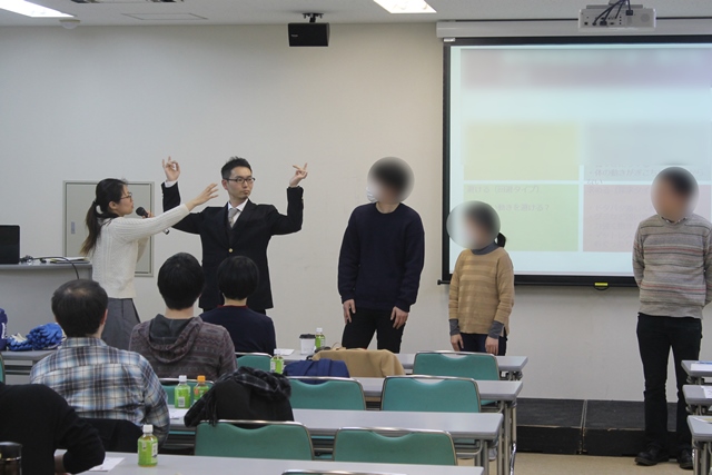 途中、実際に体を使って実技体験をしてもらうシーンもありました。