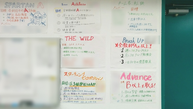 そして今、理学療法学科夜間部1年生の教室には、こんな風にグループごとの目標を掲示してあります。