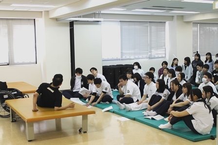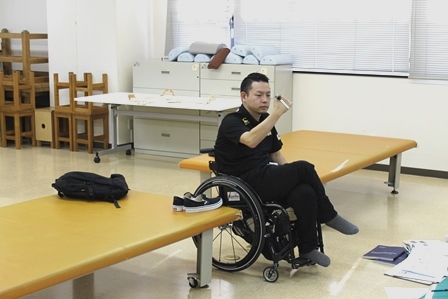 実技演習の後は、デモンストレーションを交えながら、学生からの質問に答えていただきました。ご自身が受傷してしまった時の事、その後のリハビリテーションの流れ、現在の生活の事など、いろいろな質問に対してとても気さくに答えてくれました。