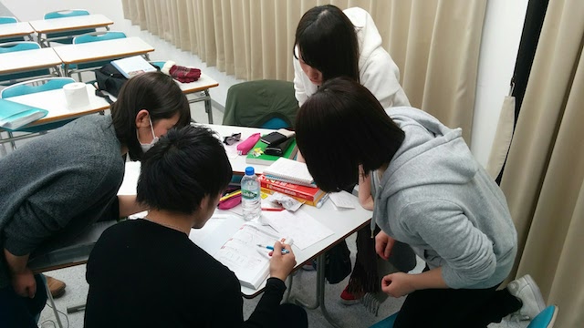 わからないことを教えあうグループや、一人黙々と勉強している人など、みんなそれぞれに最後の1日を過ごしています。