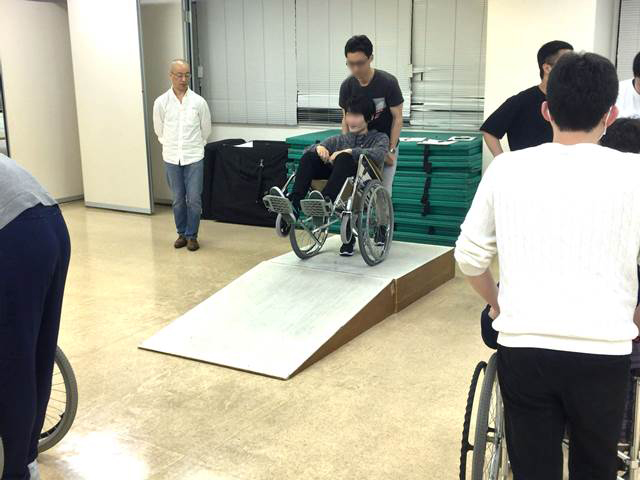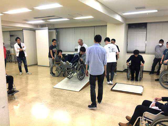実際に学生同士で車いすの操作介助方法を覚えていくのと同時に、車いすに乗った学生は、ほんの些細な段差や坂道が大きな障害物になってしまったり、車いすに乗っている側は、どんな時に「怖さを感じるか」といったことも身をもって経験できたことと思います。