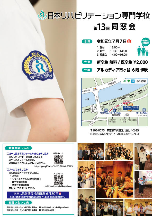 日本リハビリテーション専門学校 第13回同窓会を下記の通り開催いたします。