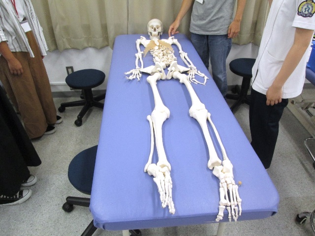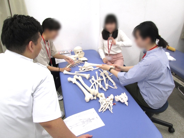 その後、グループごとに「骨標本」を見て、骨・名前・位置を意識して覚えながら、人体模型を組み立てるグループワークの時間に。