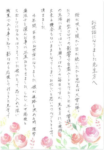 卒業生ご本人がとても親しみやすい性格の方で、ご本人の人柄も知っていたので、このお手紙を拝見させていただいた時、とても感慨深いものがあり、思わず涙があふれてきました。