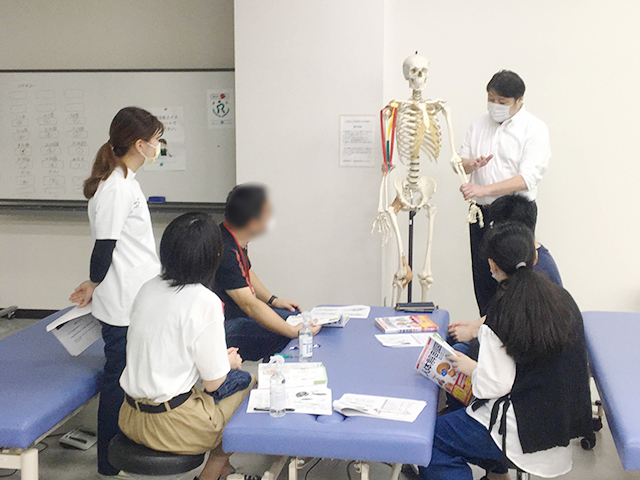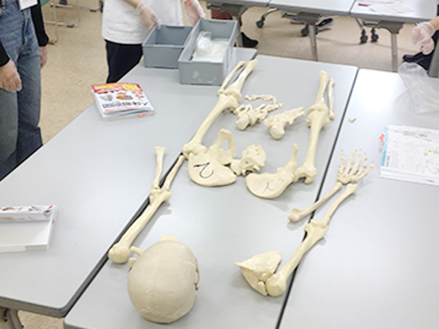 作業療法学科も理学療法学科も、昼間部も夜間部も、バラバラになっている骨模型を参考書や骨格標本を見ながら並べてみたり、筋肉について勉強してみたり、「解剖学」について少しだけ学んでもらいました。