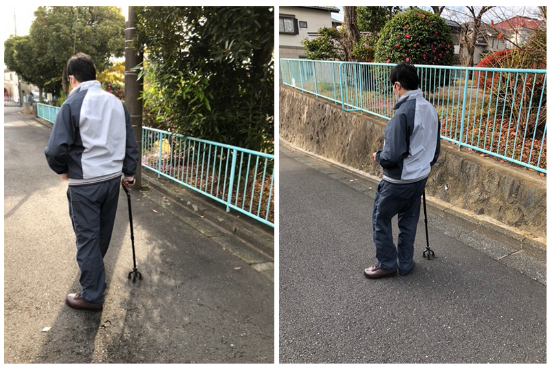 屋外を歩いているところです。坂道や車など、かなり気を使いながら歩いています。