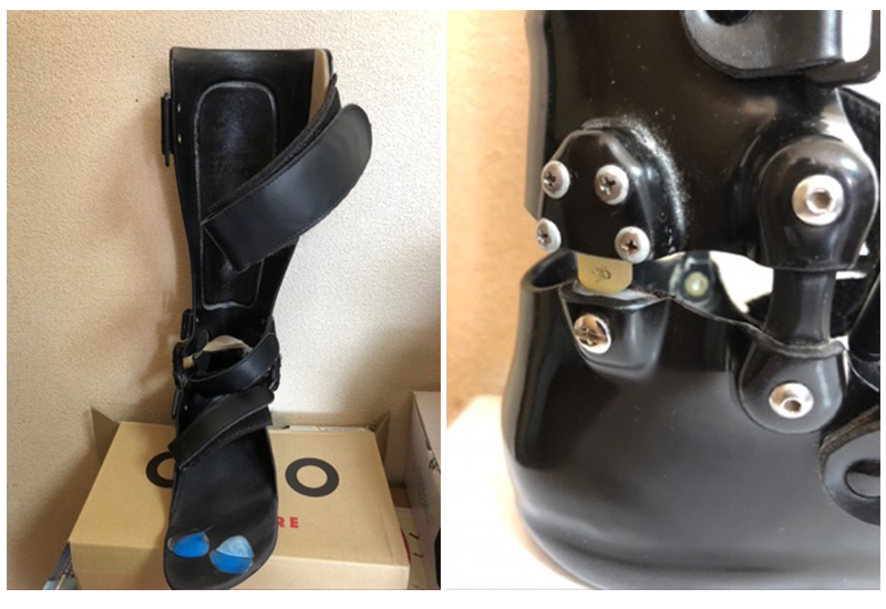 その方が歩行時に履いている足につけている装具です。足の機能を補助するための機能が色々と付加されています。