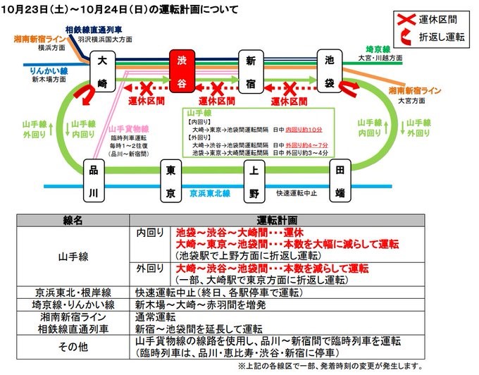 10/23(土)~10/24(日)山手線内回りの池袋~渋谷~大崎駅間が終日運休になります。