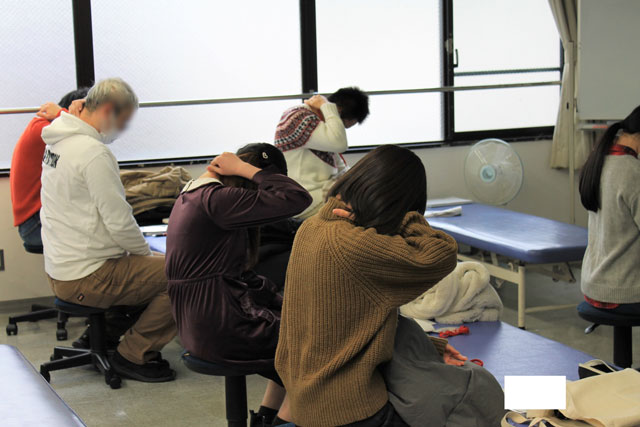 手塚先生の説明を聞きながら、実際に自分の身体をマッサージしたり、脈を測ってみたり、身体の機能を体感します。