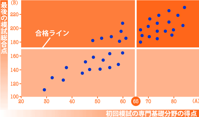 専門基礎分野とは、解剖学・生理学・運動学などの理学療法士/作業療法士にとって必要不可欠な基礎知識。上の重回帰分析の結果を見ると、横軸(A)の65点以上より右側に合格者が密集し、合格ラインを下回っている人はいない!つまり「専門基礎分野を制するものが国試を制する!」といっても過言ではない。専門基礎分野の重要性がわかるだろう。