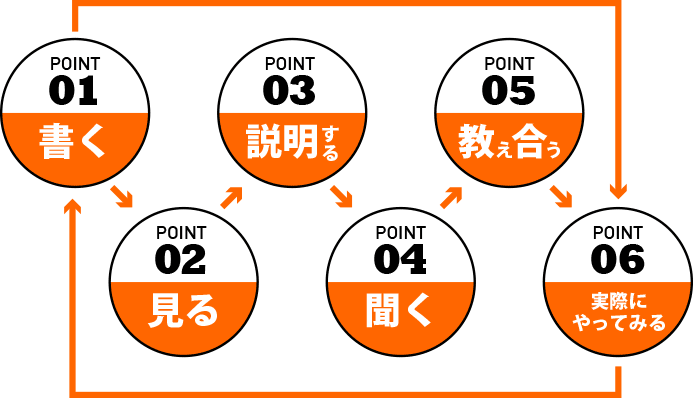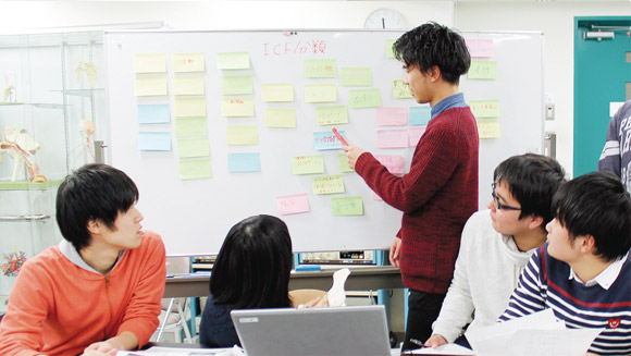 家で一人で勉強するだけでは国家試験の広い範囲全てをカバーすることは困難。日リハの国家試験対策は、グループワークを通じて、「エピソード記憶」「手続き記憶」をフル活用して学ぶ。学校でグループワークを通し、「書く・見る・説明する・聞く・教えあう・実際にやってみる」を基本に、学生自身でオリジナルの問題を作り出題し合うなど、みんなで勉強することでお互いに協力し合い、補い合える。