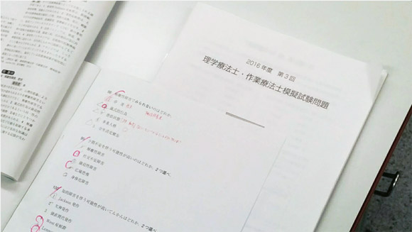 総合臨床実習終了後の10月から、ほぼ毎週模擬試験を行います。模擬試験には、全国統一の模擬試験と、日リハ独自の模擬試験があります。全国統一模擬試験は4〜5回、校内模試は約15回、合わせて約20回実施します。たくさん模擬試験を実施する理由は、「問題に慣れる」ことと、短いスパンで進捗状況を把握し、苦手な分野があれば、それを放置すせず、すぐに復習し、理解した上で次へ進めるためでもあります。また、全国統一模試は自分の進捗を客観的に把握する良い機会にもなります。