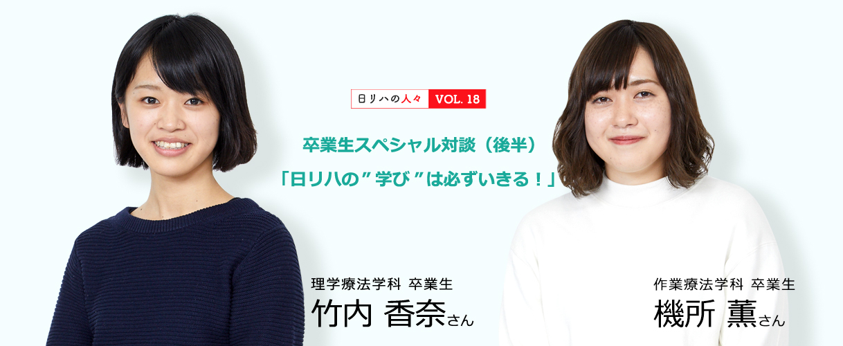 - 竹内 日リハは今の自分を育ててくれた学校で、4年間安心して学ぶことができました。楽しいことばかりではなく、大変な思いをすることもたくさんありましたが、目標を達成できて日リハを選んでよかった! とあらためて思いました。まずは一度、説明会に参加してみてください! 先生方をはじめ先輩たちや事務員さんもみんな親身になって助けてくれるので、遠慮なくどんどん頼って大丈夫です!