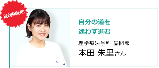 - 日リハの先生方は、一人ひとりの学生をしっかり見てくれて、それぞれの個性を考えながら、ストロングポイントを伸ばすようなアプローチをしてくれます。そして、在学中は自分の“手”を繰り返し使って、たくさんの事を学んでいきます。日リハでしっかり学べば、臨床に出ても自信をもって患者様と向き合うことができるようになります。