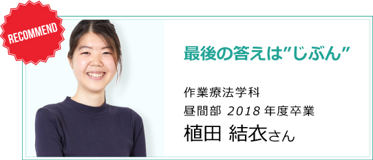リハビリテーションの中で、作業療法士は作業を通してその方の生きがいをサポートしていくという点で興味を持ち、この分野なら自分の力を発揮できると思って、作業療法士を目指すことにしました。