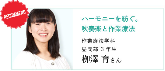 - 「実習が終わった後に、普段厳しい先生との面談で、“佑実は実習へ行って変わったね。このまま頑張ればいいセラピストになれるよ。”と言ってもらえました。この言葉はとても大きな自信になりました。それと、実習を経験した後の方が勉強が断然楽しくなりましたね。」