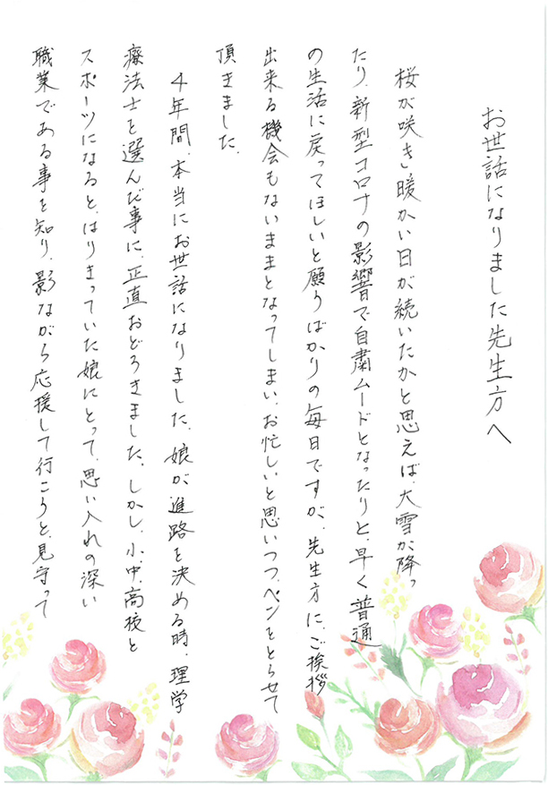 - 4年間本当にお世話になりました。娘が進路を決める時、理学療法士を選んだことに、正直驚きました。しかし、小、中、高校とスポーツになると、はりきっていた娘にとって、思い入れの深い職業出る事を知り、陰ながら応援していこうと見守って来ました。