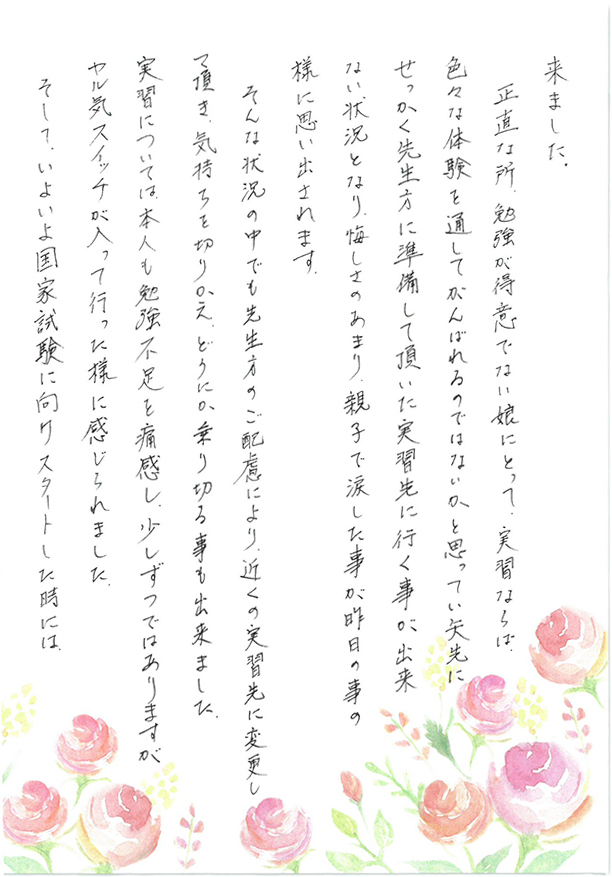 - 正直な所、勉強が得意でない娘にとって、実習ならば色々な体験を通して頑張れるのではないかと思っていた矢先に、せっかく先生方に準備して頂いた実習先に行く事が出来ない状況となり、悔しさのあまり親子で涙したことが昨日の事のように思い出されます。そんな状況の中でも先生方のご配慮により、近くの実習先に変更して頂き、気持ちを切りかえ、どうにか乗り切ることもできました。実習については、本人も勉強不足を痛感し、少しずつではありますが、ヤル気スイッチが入って行った様に感じられました。