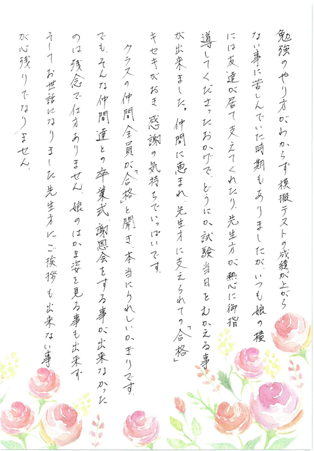 「卒業生のお母様から大変うれしいお手紙をいただきました。ご本人の了解をいただきましたので、公開させていただきます。」