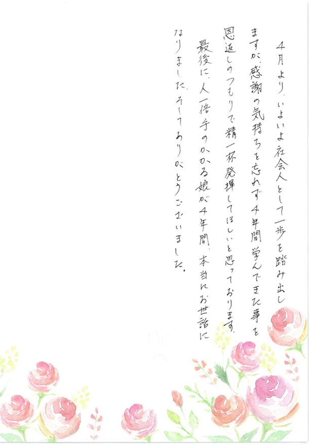 - でも、そんな仲間達との卒業式、謝恩会をする事が出来なかったのは残念で仕方ありません。娘のはかま姿を見る事も出来ず、そして、お世話になりました先生方にご挨拶もできない事が心残りでなりません。4月より、いよいよ社会人として一歩を踏み出しますが、感謝の気持ちを忘れず、4年間学んできた事を恩返しのつもりで精一杯発揮してほしいと思っております。最後に、人一倍手のかかる娘が、4年間、本当にお世話になりました、そして、ありがとうございました。