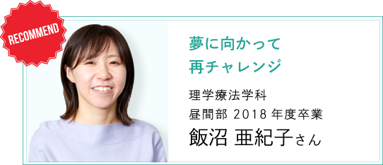 - 理学療法士は病院だけが現場なのではなく、本人次第ではスポーツの世界でも活躍できるんだという事がわかったんです。それで、自分もそのボランティアの方のようにスポーツ選手の助けになりたいと思って、理学療法士を目指すことにしました。
