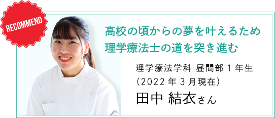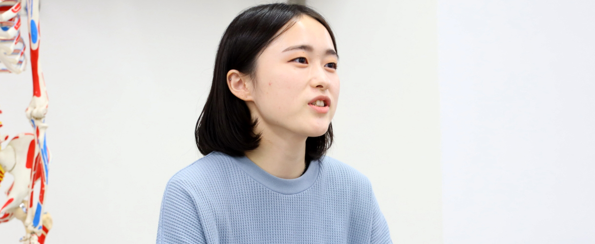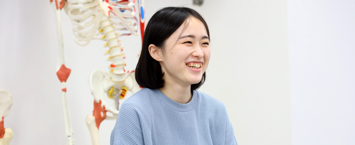 - 私は高校時代にチアダンス部に所属していたのですが、定期的に来てくださる理学療法士の方がいらっしゃって、“その人みたいになりたい”と憧れを抱いたことが理学療法士を目指すきっかけになりました。幾つかの学校のオープンキャンパスに行って検討したのですが、どうしても「3年制の学校は忙しくて厳しいだろうな」というイメージが拭えなくて。なるべく余裕をもって4年間を費やして学びたいと思ったので、日リハを選びました。