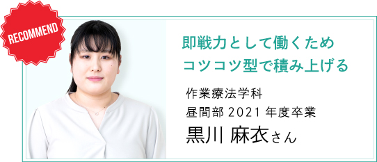 もともと部活では陸上部に所属し、長距離走をやっていたこともあり、理学療法士に興味があったのですが、日常的な動作に携わることができる方が自分には合っている、身体の動きや持久力の向上などリハビリに携わりたいと思い、作業療法士になることを目指しました。