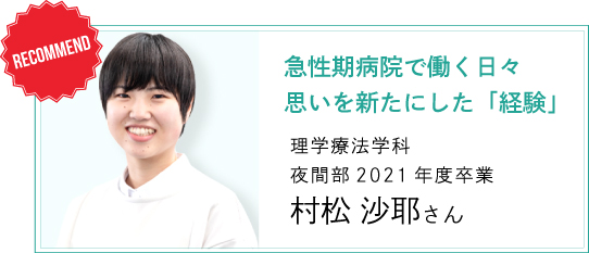 - 今の病院で働く日々は、担任だった高瀬先生の授業でかけられた言葉に支えられてきました。ある授業が終わった時のこと、高瀬先生が「今日の内容をちゃんと理解した君たちだったら、臨床現場に出た時に、中途半端なリハビリで終わりにしてはいけないなと必ず気づくはずです」と仰いました。その時は、その言葉が意味することをしっかりと理解できたわけではありませんでしたが、ずっと頭のどこかにひっかかっていたのです。
