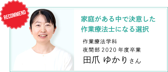 - Q. 関崎さんには、以前に「日リハ夜間部女子が日々の学びを語り合う。」に登場していただいてからのストーリーを語っていただきたいと思います。入職後のことを振り返っていただけますか?