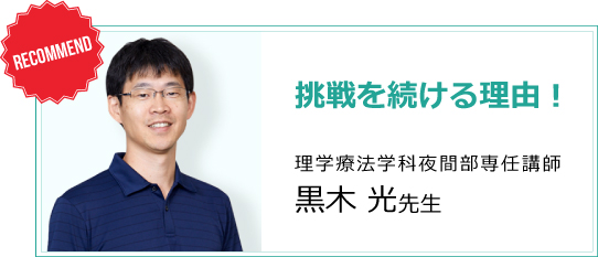 日リハ夜間部を選んだ理由のひとつは、実習時間が長いことです。年齢的に少し遅い就職となってしまうので、就職後すぐに即戦力となれるよう現場での経験を少しでも多く積みたいと思ったからです。