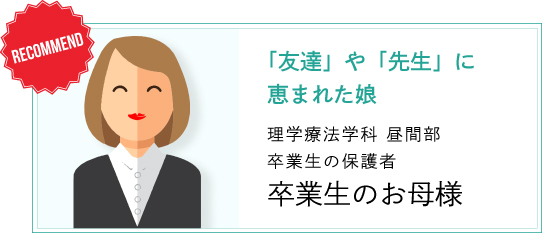 - 机上だけの勉強だけでは分からない、現場での知識、患者様に対しての接し方、考え方を多く吸収したくて、実習時間が多い日リハが良いなと思いました。やっぱり実習に行って、学校だけの勉強じゃわからないところとか、現場の先生からもたくさん教えてくれるのかなって。親にも話をして「そういうのならいいじゃない」って言って、後押ししてくれました。