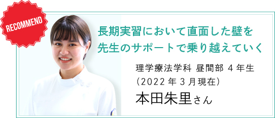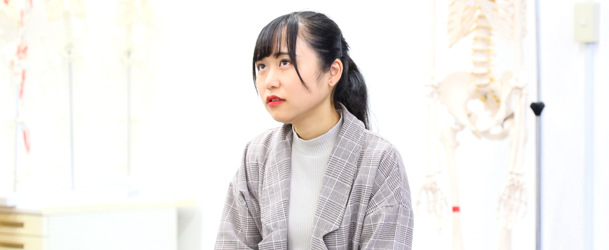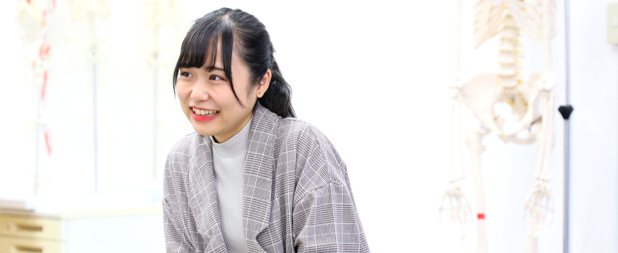 - もともと学校選びの段階から少人数制に魅力を感じていました。大学ではなく専門学校を選んだのもそこが大きな理由の一つです。大学はどうしても大人数に対して先生が一人という形式であり、講義も先生が一方的に話をするスタイルが多いですよね。一方で日リハの場合は、教室での先生との物理的な距離ももちろんですが、授業でわからないことが出てきた時にすぐに訊きに行けるという精神的な距離の近さもあるように思います。だからこそ、入学後にギャップを感じたりするようなことはありませんでした。