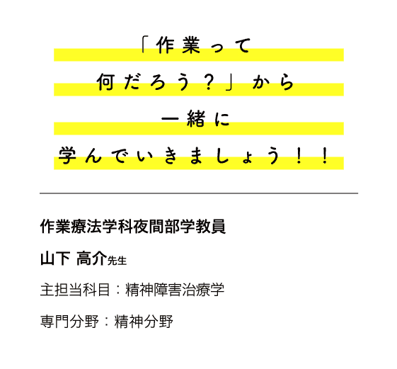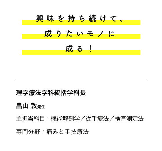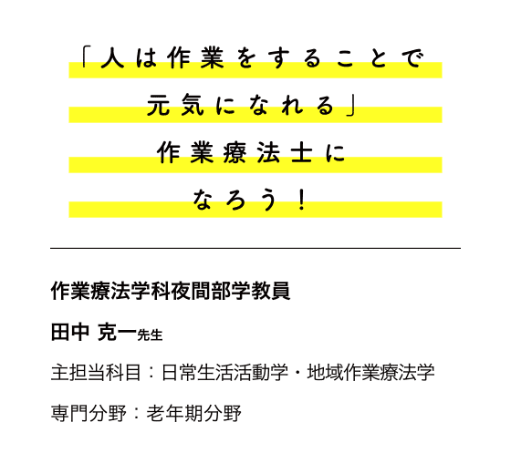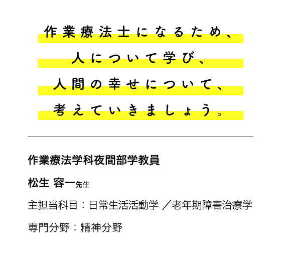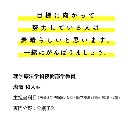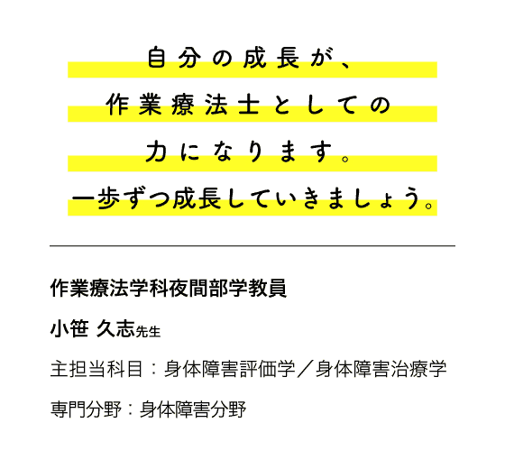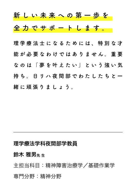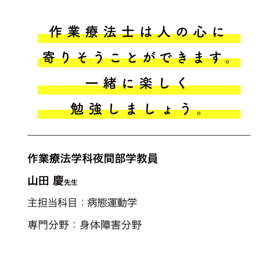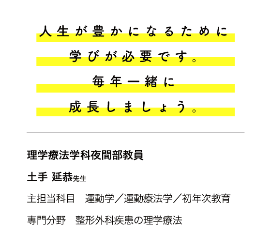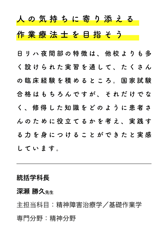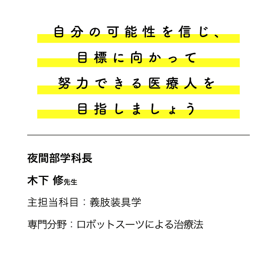 日リハの夜間部担当教員は、夜間部を専門に教育を行っているプロ集団。さまざまな経験をもって入学してくる学生ひとり一人のニーズを個別に把握しながら、4年間の学びをきめ細かくフォローします。「圧倒的めんどうみ主義」を支えるのは、夜間部の教育を専門とする教員たちです。