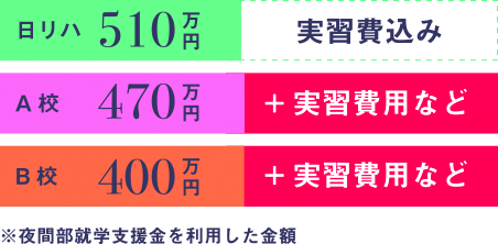 日リハは別途徴収がないから安心して実習に集中できます。実習施設との手続き、宿泊先手配なども学校で行うので面倒な手続きもない。 「下記が学費に含まれます。」