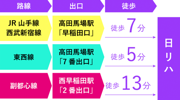 優先順位を低くしがちな立地条件。でも、昼間に仕事していれば、「通いやすさ」は重要なポイント。通学で疲れたらモチベーションの維持も大変。日リハは新宿、渋谷、池袋など、どこからでもアクセスが良い高田馬場にある。しかも高田馬場駅から徒歩7分「通いやすさ」は「学びやすさ」です。